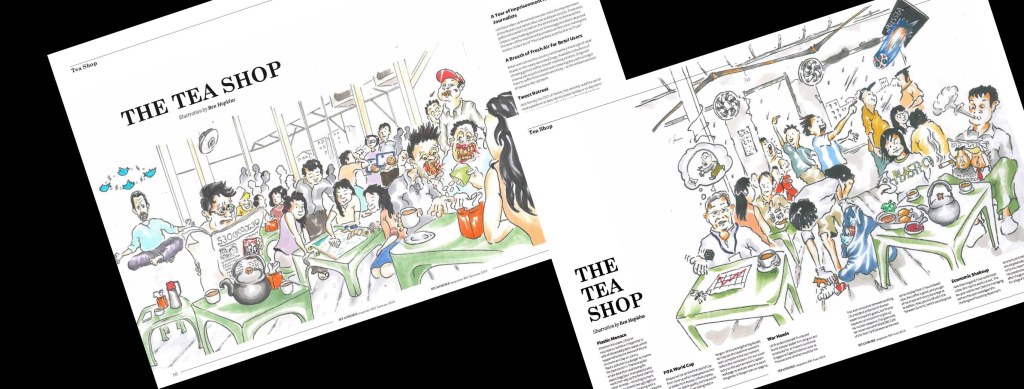 The Tea Shop was a monthly series during my time as Senior Editor of Myanmore when it was a print magazine. Conversational and political topics of the month were captured in a typical Yangon tea shop scene.